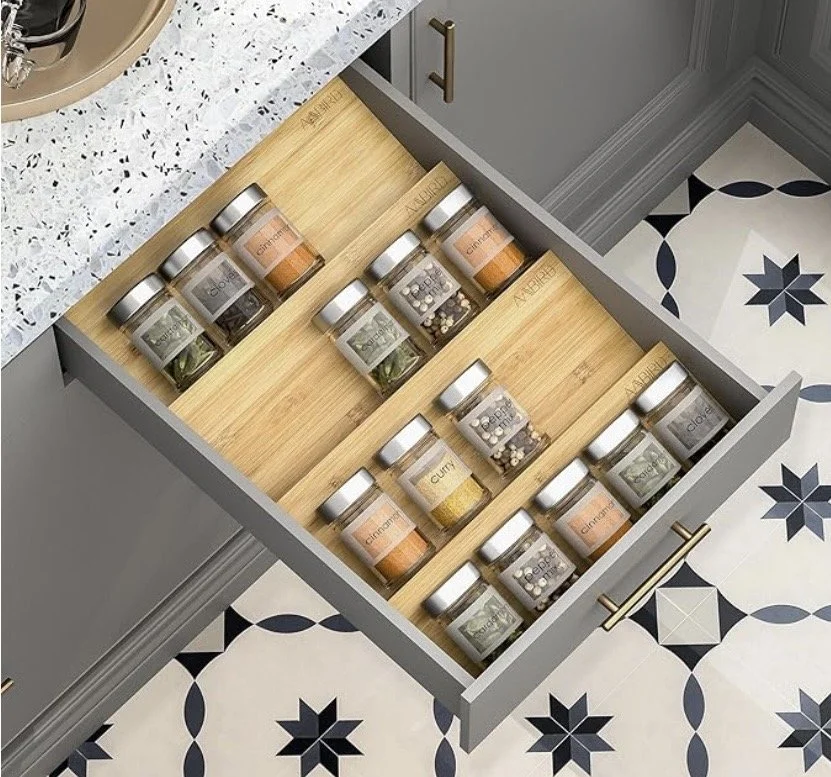 I love these for my spice jar drawer, they stack and can be laid side to side. Make sure to measure your drawer to see how many you can fit. Tip: I used a thin strip of drawer liner along where they overlap so they stay in place.